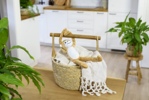 Plyšová opica s dlhými ramenami a zapínaním na suchý zips. Vyšívacie oči. Vrátane papierového štítku pre potlač.