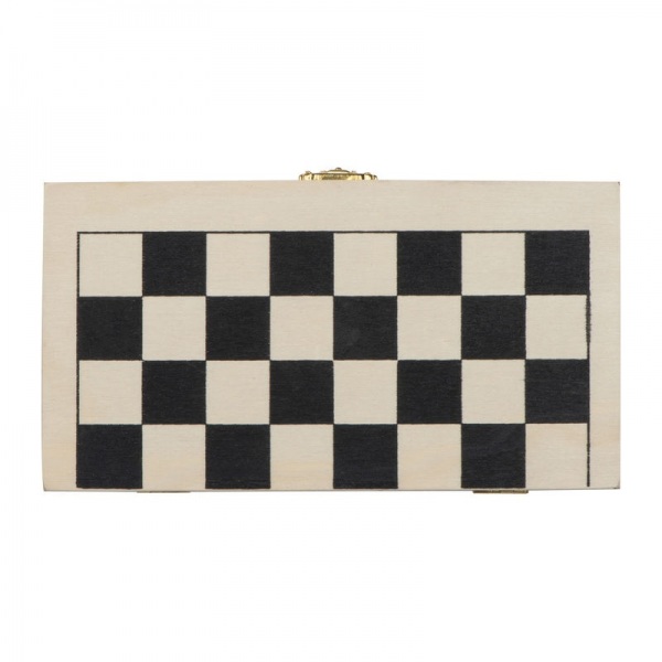 Drevená cestovná herná súprava s backgammonom, šachom a dámou.