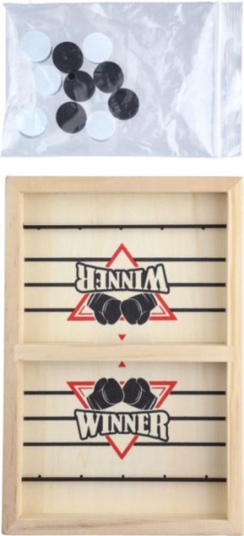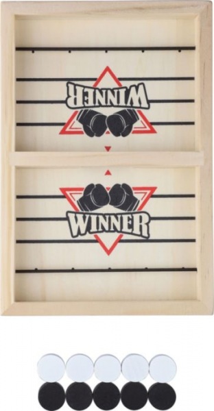 Drevená vyhadzovacia hra. Obsahuje 10 šachových žetónov (5 bielych a 5 čiernych) a návod na použitie. Rýchla hra zameraná na zručnosť pre dospelých s celkovo 11 dielmi. Jednotlivo balené v hnedej kartónovej krabici s ilustrovanou prednou stranou.
