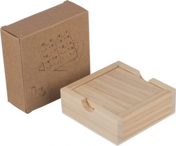 Mini sudoku sada z borovicového dreva s výsuvným hracím poľom a vnútorným úložným priestorom pre 16 hracích kolkov. Jednotlivo balená v hnedej kartónovej krabici.