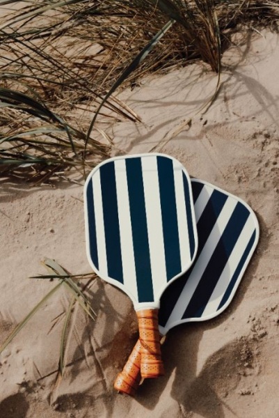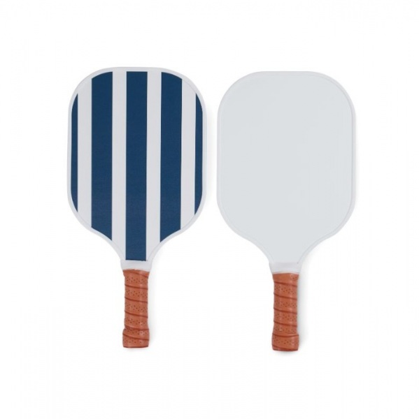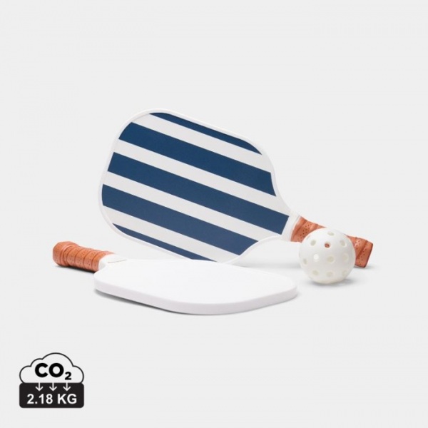 Sada na pickleball obsahuje dve rakety a jednu loptičku. Rakety s klasickým dvojfarebným pruhovaným dizajnom na jednej strane a čistým bielym povrchom na druhej. Rukoväť z PU materiálu ponúka pohodlný úchop. Súčasťou je aj návod.