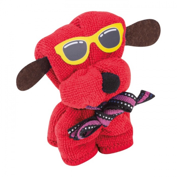 Mäkká mikrovláknová handrička (20 x 20 cm) zložená do tvaru psíka.