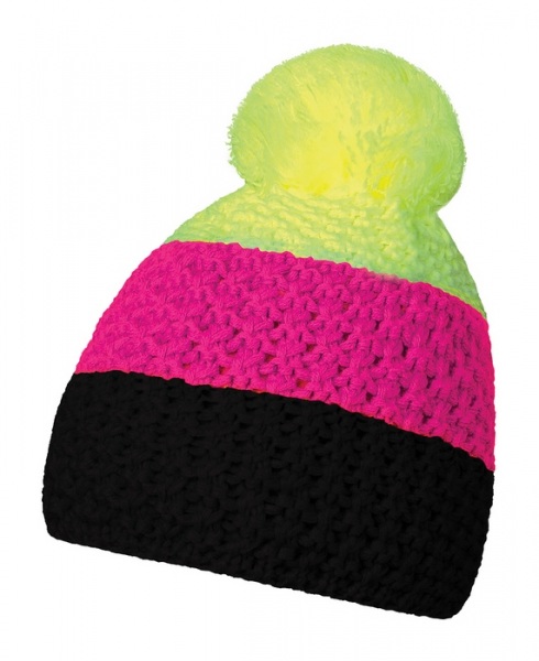 Zimná čiapka vyrobená v Českej republike zo 100% acrylu pomocou vrkočového pletenia. Vnútorná strana z fleece. Čiapka má tri vodorovné pruhy a brmbolec.