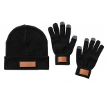 Akrylová pletená zimná čiapka a rukavice na dotykovú obrazovku s potlačiteľnými nášivkami z PU kože, v jednej veľkosti pre dospelých.