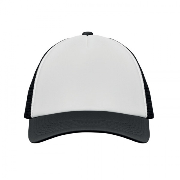 5 panelová trucker čiapka z polyesteru 140-150 g/m2, s nastavovacím plastovým patentným uzáverom. Biely predný panel a farebný priezor z polyesterového džerseja s penovým podkladom. Ostatné panely vo farbe sieťoviny. Veľkosť 7 1/4.