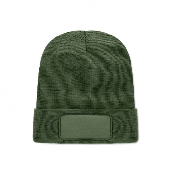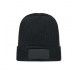 Unisex pletená čiapka z mäkkého pružného RPET polyesteru s manžetou a nášivkou.