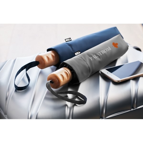 Manuálne skladací 21" dáždnik má 3-dielnu čiernu konštrukciu a drevenú rukoväť. Vrátane puzdra.