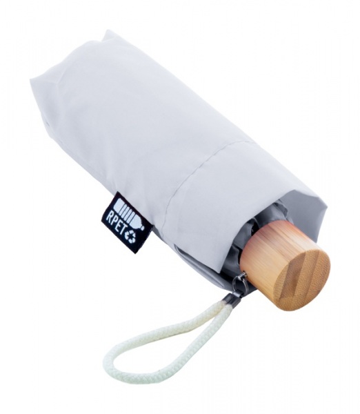 Manuálne, vetruodolný 3-skladací mini dáždnik s 6 panelmi v puzdre v zodpovedajúcej farbe. S kovovým rámom, sklolaminátovými rebrami, bambusovou rukoväťou a bavlneným remienkom na ruku. 190T RPET pongee, s výrazným štítkom RPET.