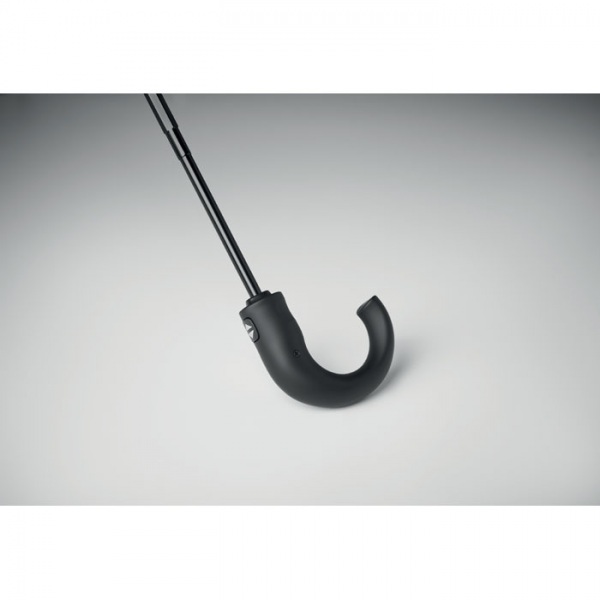 23-palcový 3-dielny open-close dáždnik odolný voči vetru z dvojvrstvového 190T pongee s kockovaným vnútorným vzorom. Čierny pokovovaný rám a hriadeľ. Dvojdielna stredná časť poniklovaná čiernym sklolaminátom. Drevená zakrivená rukoväť.