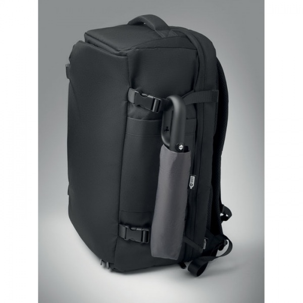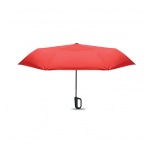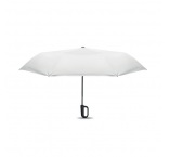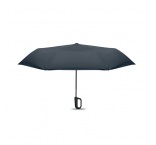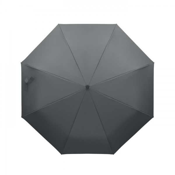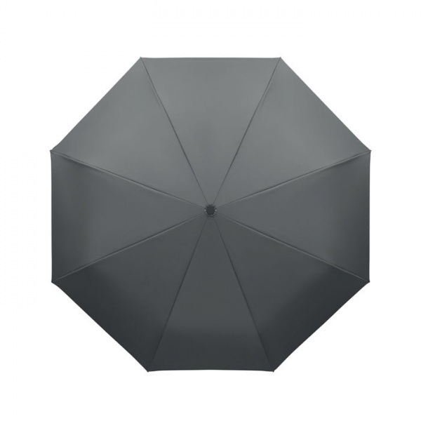 Skladací 21-palcový vetruodolný dáždnik s celočiernym pokovovaným rámom zo sklenených vlákien s 2 sekciami. Rebrá zo sklenených vlákien. Panely z 190T RPET pongee. Karabína v tvare D s gumenou úpravou. Automatické otváranie a zatváranie. Vrátane puzdra.