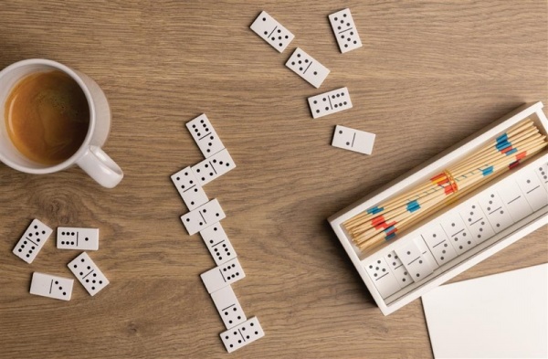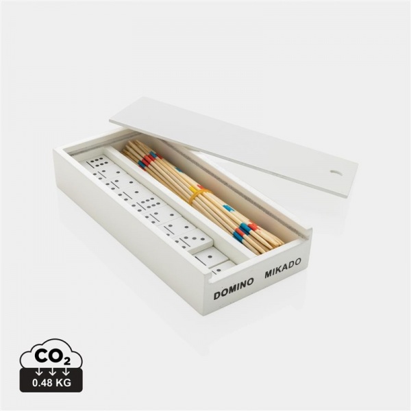Drevená sada dvoch klasických hier, ktorá obsahuje: domino (28 kociek) a mikádo (41 tyčiniek). Balené v bielej drevenej krabičke pre ľahký prenos kamkoľvek na cesty. Vyrobené z dreva s FSC® certifikáciou. Balené v FSC® kraftovej darčekovej krabičke.
