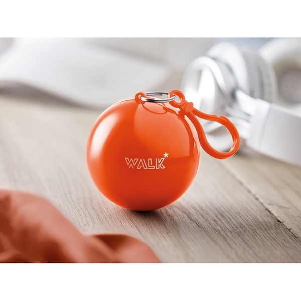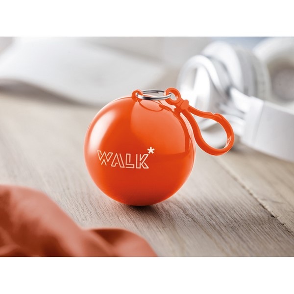 Pršiplášť v plastovej guličke s karabínkou.