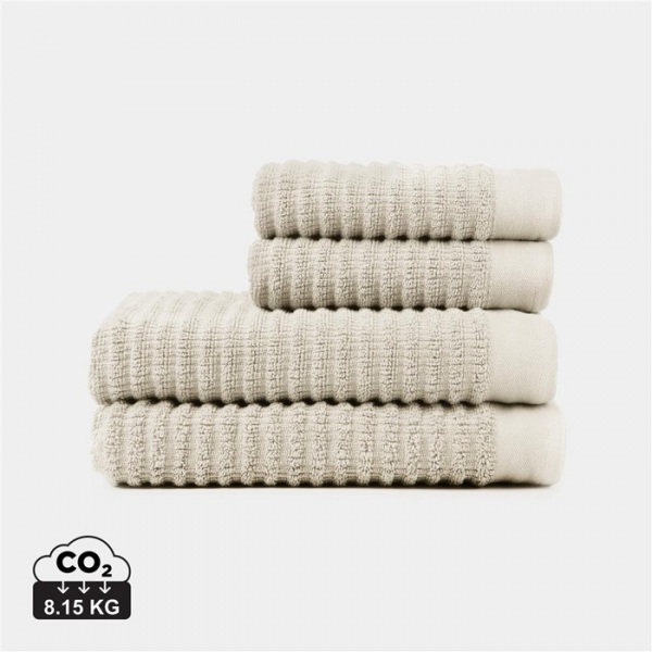 Luxusná sada bavlnených uterákov a osušiek s textúrou dobby s vysokou savosťou. Súprava obsahuje 2 ks uterákov (50 x 70 cm) a 2 ks osušiek (70 x 140 cm). Zabalené v FSC kraftovom balení. Gramáž bavlny: 500g/m2.
