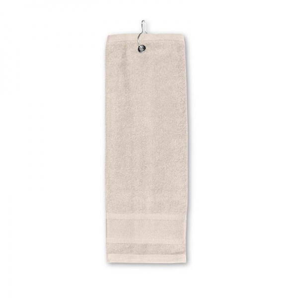 Multifunkčný bavlnený uterák (430 g/m?) s kovovým háčikom. Mäkký k pokožke a veľmi savý, je ideálny na šport, ako je golf alebo na použitie v kuchyni. Praktické na zavesenie vďaka ľahko použiteľnému háčiku. Vyrobené v Európe