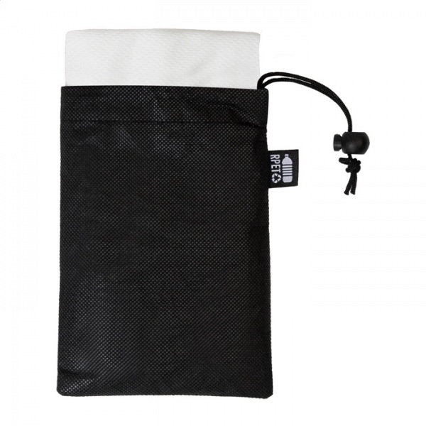 Športový uterák z mikrovlákna RPET v prepravnom puzdre z netkanej tkaniny RPET s charakteristickou etiketou RPET. Polyester RPET, 140 g/m2.
