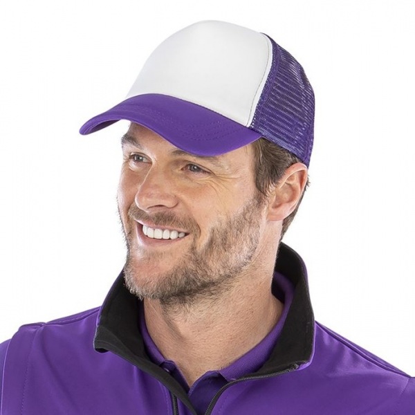 Polyester s vypchávkou | 5 panelov - 4 ôčká a 1 pevná látka | Biely predný diel s kontrastnou farebnou sieťkou a špičkou | Nastaviteľný snapback | Zaoblený textilný šilt | Odtrhávací štítok