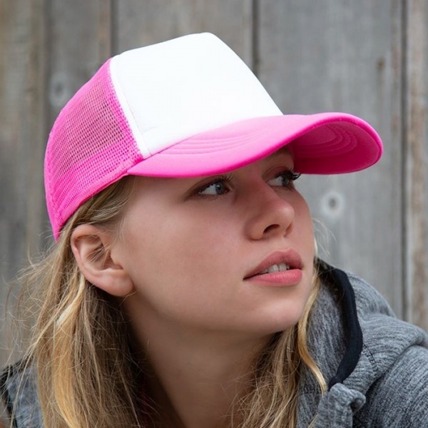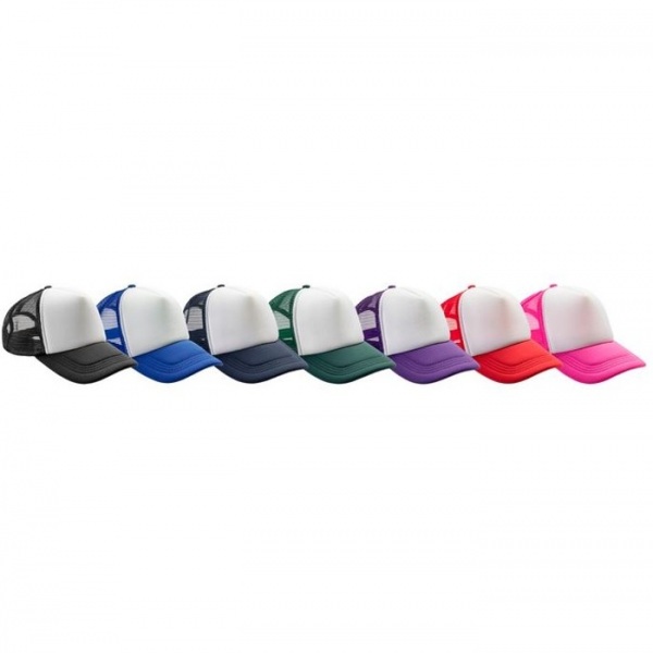 Polyester s vypchávkou | 5 panelov - 4 ôčká a 1 pevná látka | Biely predný diel s kontrastnou farebnou sieťkou a špičkou | Nastaviteľný snapback | Zaoblený textilný šilt | Odtrhávací štítok