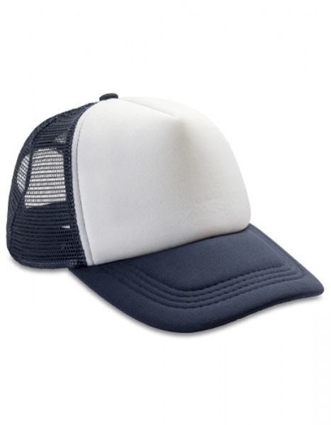 Polyester s vypchávkou | 5 panelov - 4 ôčká a 1 pevná látka | Biely predný diel s kontrastnou farebnou sieťkou a špičkou | Nastaviteľný snapback | Zaoblený textilný šilt | Odtrhávací štítok